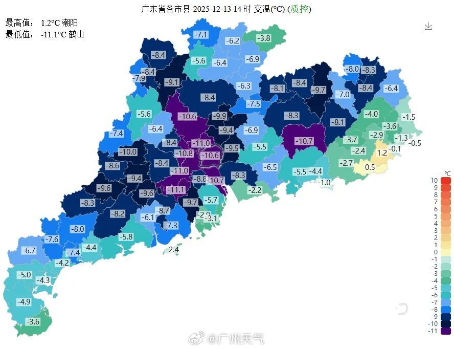 广东省好意思瞻念台考虑,12月13日—14日受中等偏强冷空气影响,广东将有一次小到中雨局部大雨和4℃~8℃降温的天气经过,并伴有5~7级阵风,最低气温将出咫尺12月14日或15日清晨:粤北市县4℃~8℃,部分市县有5℃以下的低温天气,高海拔山区0℃驾驭,局部有霜(冰)冻,南部市县13℃~15℃,其余市县8℃~12℃。12月15日白日气温逍遥回升。