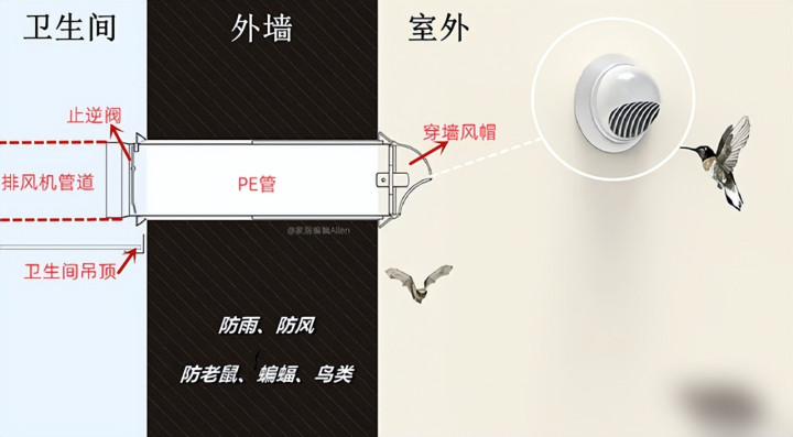 卫生间也别漏了穿墙风帽,防鸟防虫防倒灌,整套下来百元内料理,用得宽解。