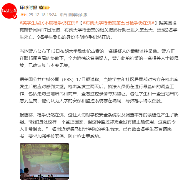 据好意思国全球播送公司(PBS)17日报谈称,当地学生和社区住户齐对官方在枪击案发生后的应答感到失望。枪击案发生两天后,国法东谈主员仍在进行最基础的窥探职责,包括拜访当地住户和商户,寻查监控摄像寻找物证。这让学生和一些当地住户感到消极,他们觉得大学的安保和监控系统存在疏漏,导致枪手得以逃走。